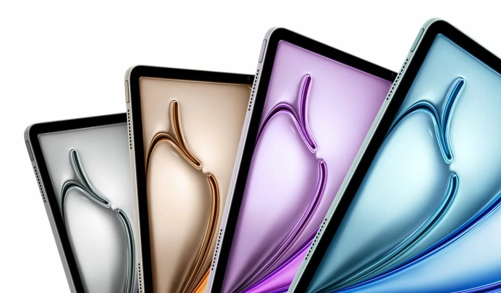 Два размера — 11 дюймов и 13 дюймов — с привычным алюминиевым корпусом. Четыре цвета: Space Gray, Blue, Purple и Starlight. Touch ID встроен в кнопку питания, фронтальная камера расположена на длинной стороне для удобства в горизонтальном положении.