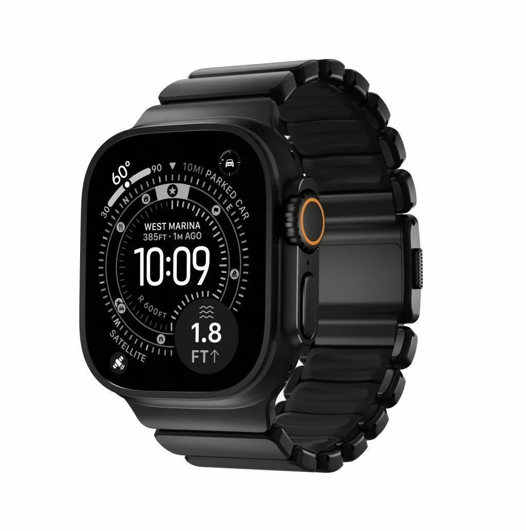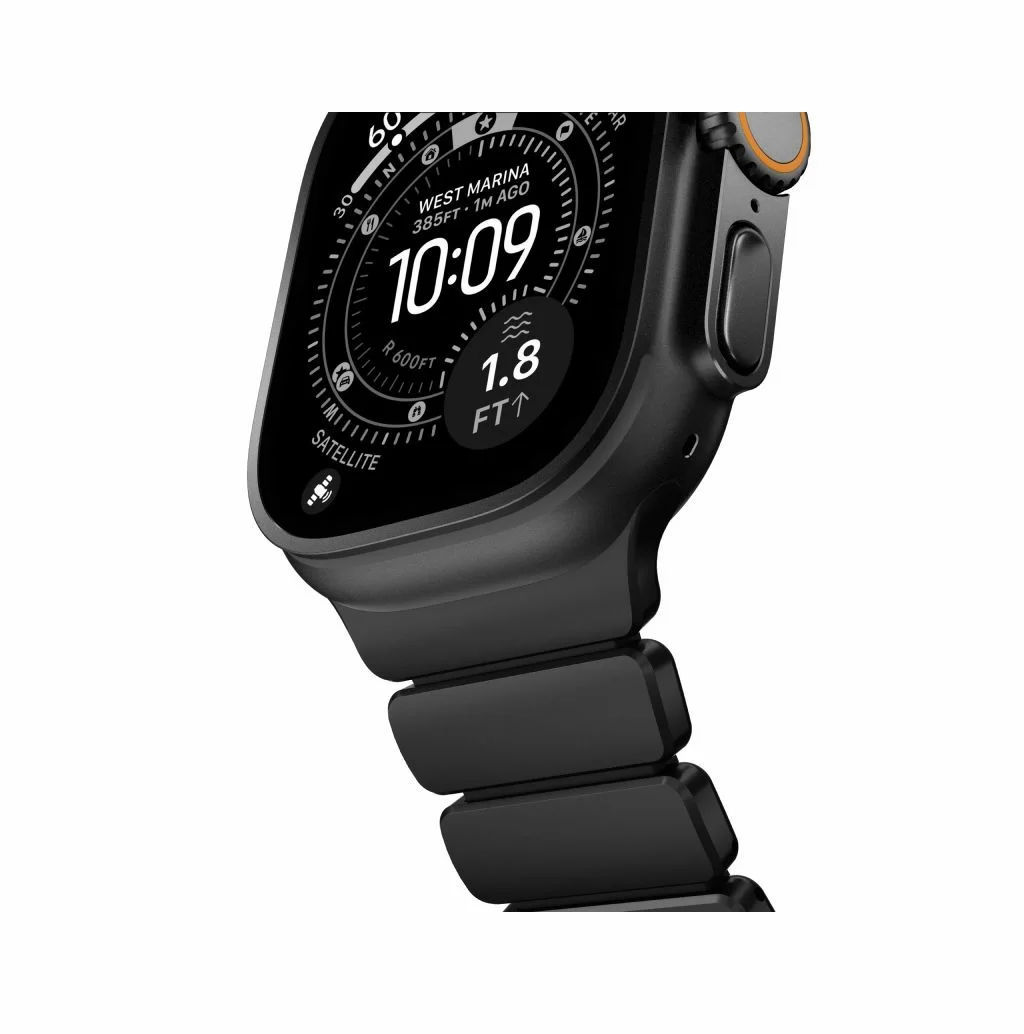 Ремешок Nomad Stratos объединяет несочетаемое: внешний каркас звеньев отлит из титана Grade 4, а внутренняя часть выполнена из мягкого фторэластомера (FKM). Титан Grade 4 значительно прочнее стандартных сплавов, используемых в аксессуарах, а специальное DLC-покрытие защищает поверхность металла от царапин и потертостей, сохраняя премиальный вид даже при жесткой эксплуатации.